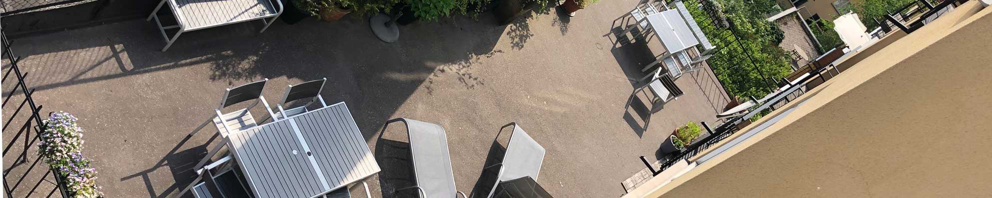 Föreningens har en stor gemensamma terrass i söderläge. Terrassen är möblerad och föreningen köper årligen nya växter för utsmyckning och trivsel. Terrassen är gemensam för alla boende i huset. Hela terrassen kan inte bokas för privat bruk men vid behov kan borden bokas i förväg via bokningstavlan i trapphuset. Då terrassen är till för alla i huset så man kan inte räkna med att få ha hela terrassen för sig själv, oavsett om man bokat ett eller flera bord.